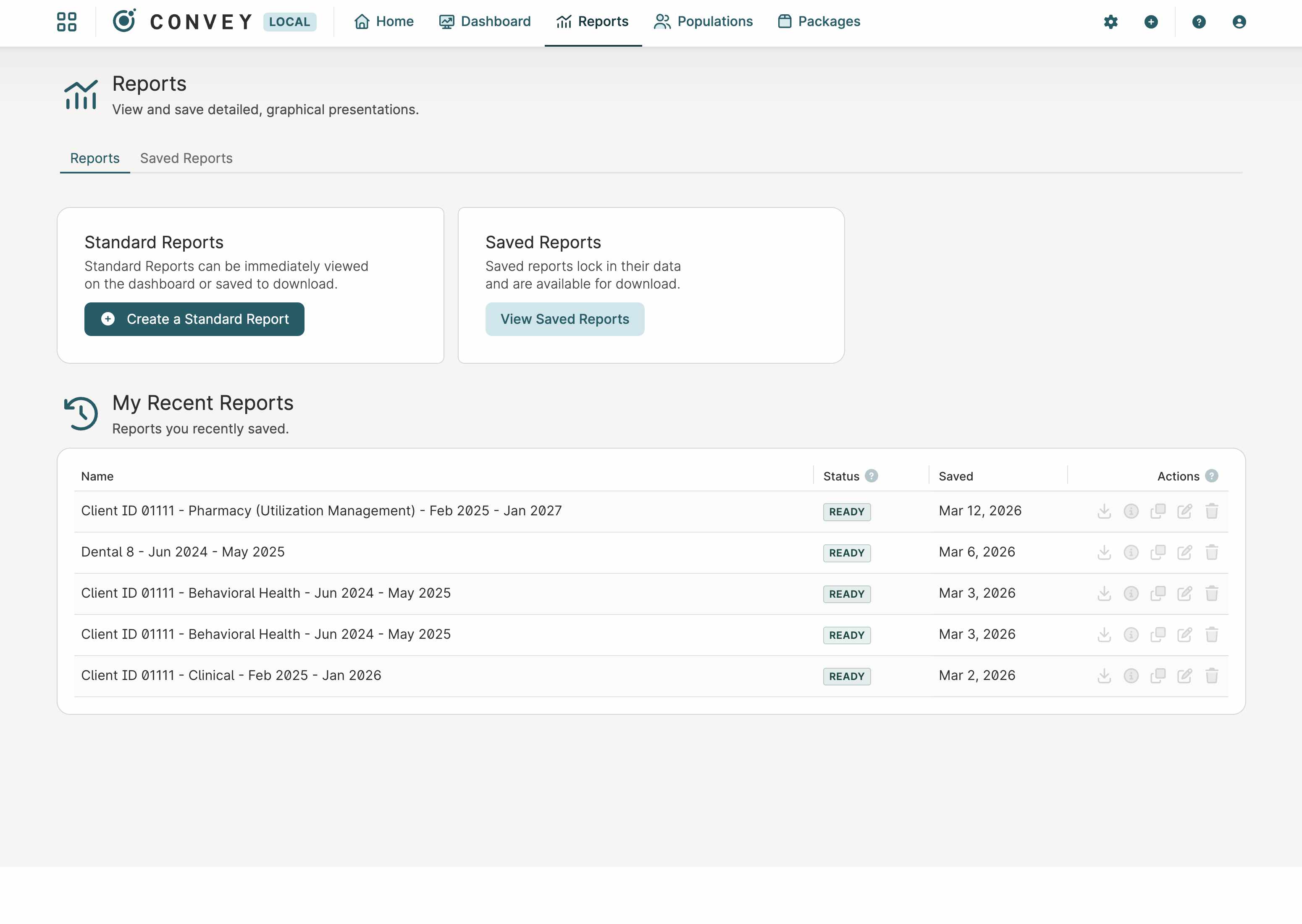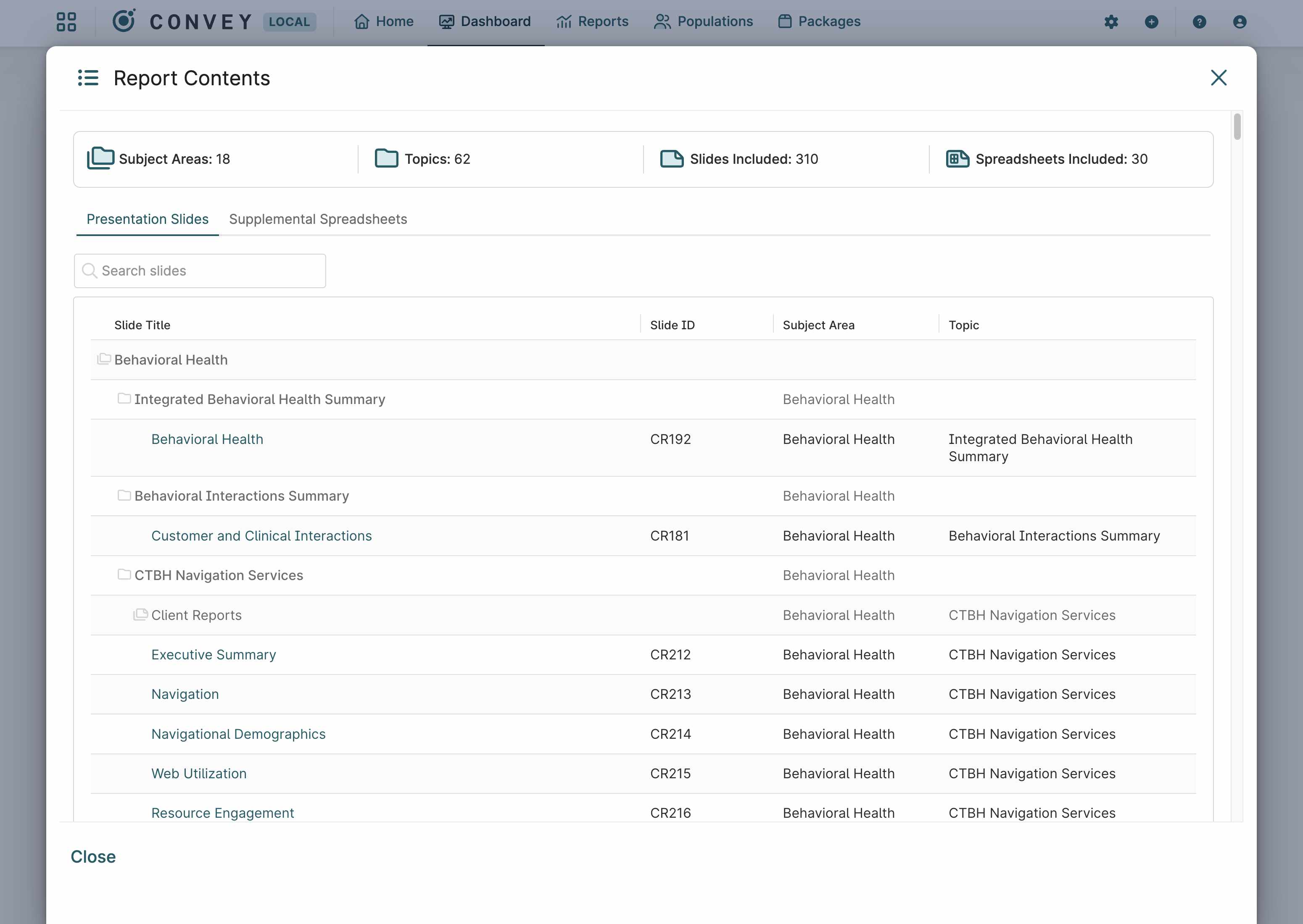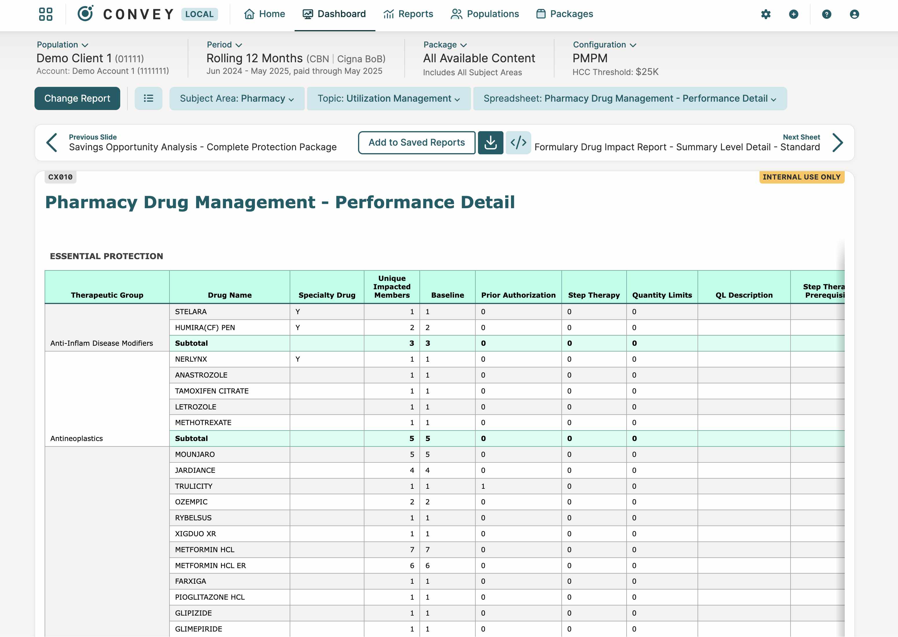 Convey is Cigna/Evernorth’s dynamic internal reporting platform, turning client utilization data into branded PowerPoint decks and Excel workbooks — delivered through a web application account executives use to configure, view, save, and export reports for their clients.