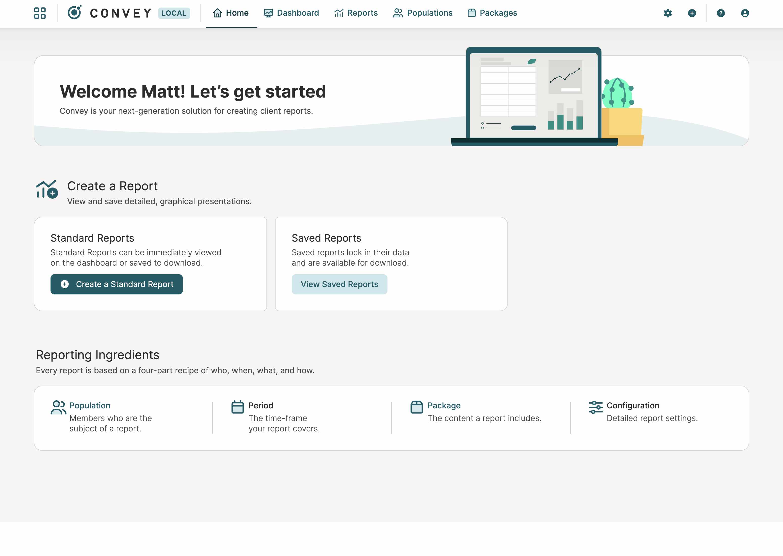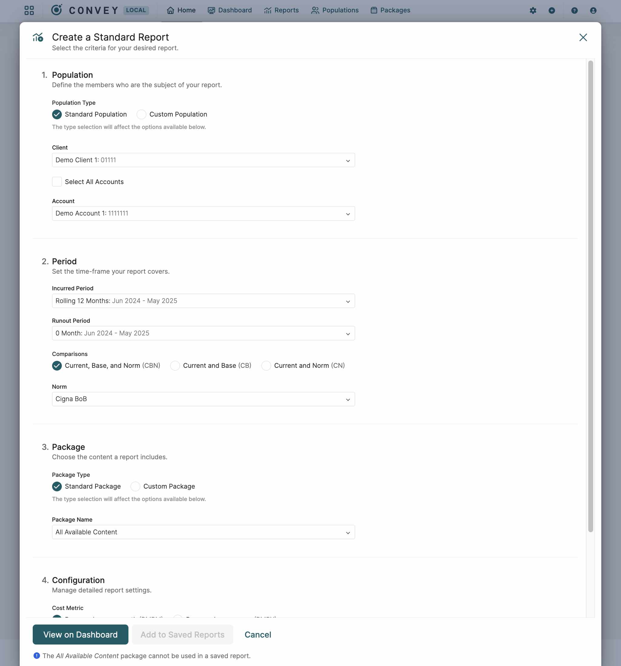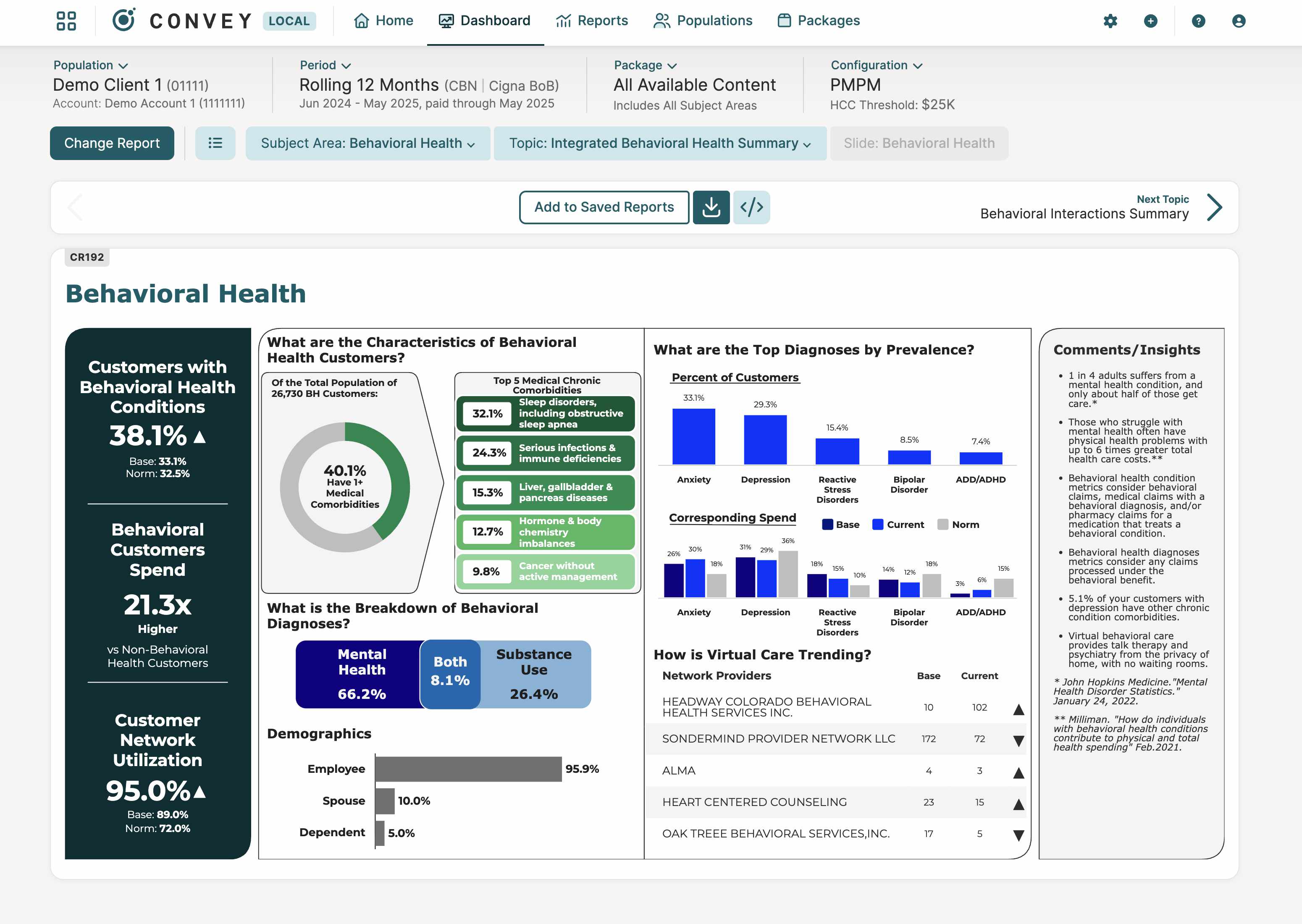 Convey is Cigna/Evernorth’s dynamic internal reporting platform, turning client utilization data into branded PowerPoint decks and Excel workbooks — delivered through a web application account executives use to configure, view, save, and export reports for their clients.